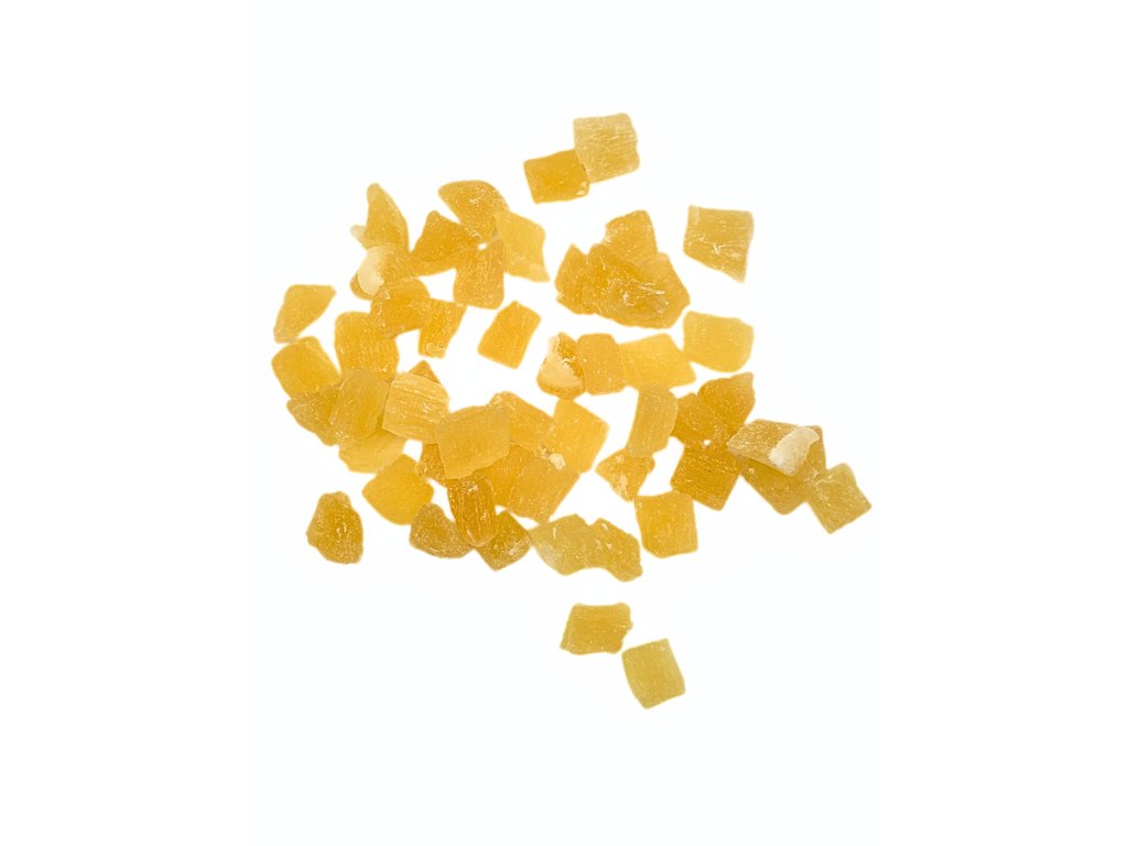 Spracované ovocie kandizované. Zloženie : ananás 53 %, cukor, regulátor kyslosti : kyselina citrónová, konzervačná látka : DISIRIČITÁN SODNÝ.