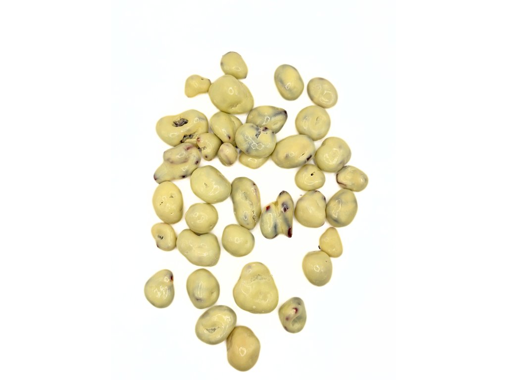 Zloženie : Brusnice kandizované 50 % ( brusnice, cukor, slnečnicový olej ), biela čokoláda 49 % ( cukor, kakaové maslo, sušené plnotučnéMLIEKO, emulgátor : lecitíny (SÓJA), vanilkový extrakt ), leštiaca zmes [ glukózový sirup, povlaková látka ( arabská guma, šelak ), rastlinný olej (kokosový, repkový), maltodextrín )].