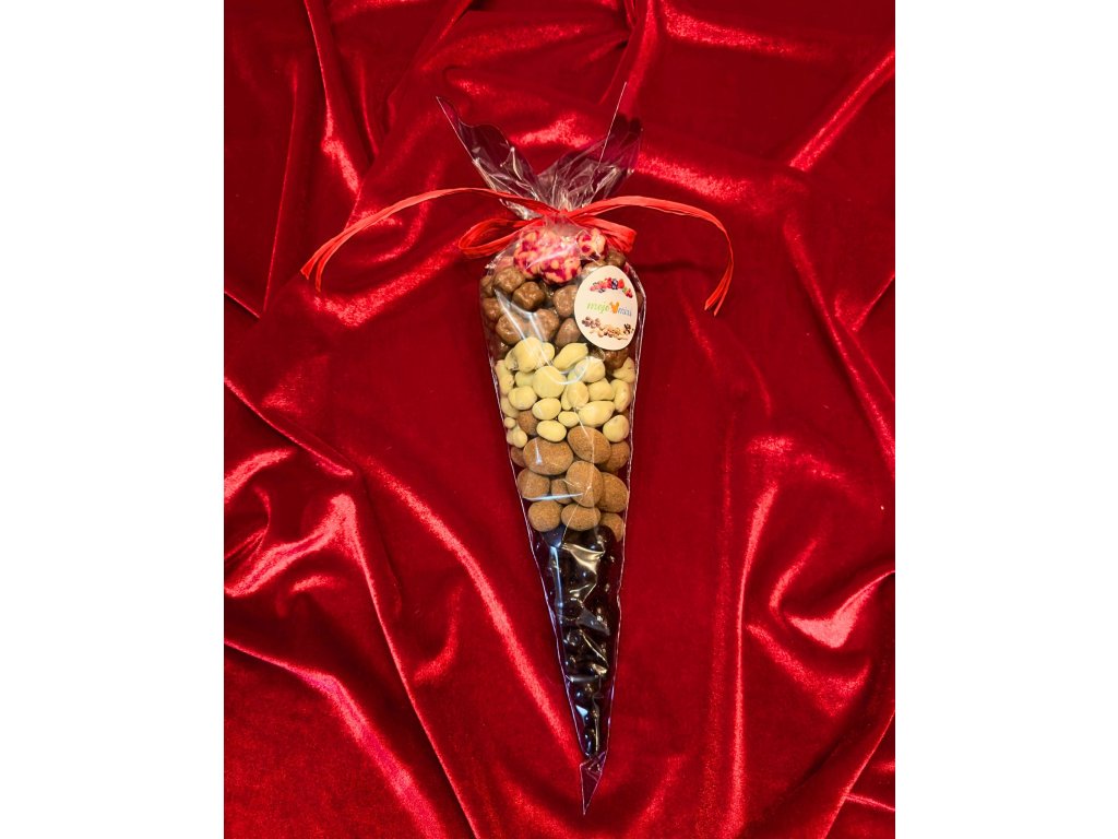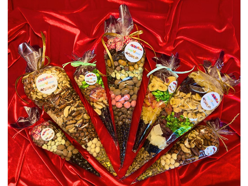 Višne v horkej čokoláde, mandle v mliečnej čokoláde so škoricou, brusnice v bielej čokoláde, kokos v mliečnej čokoláde, maliny v bielej čokoláde