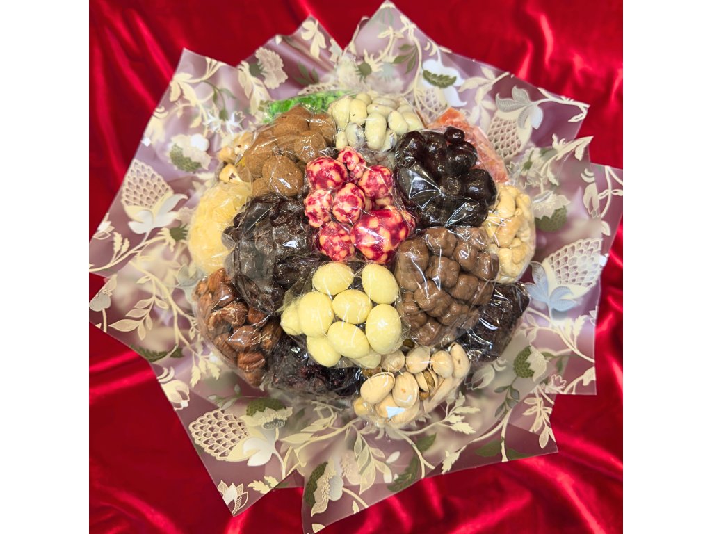 Maliny v bielej čokoláde, vlašské orechy v horkej čokoláde, mandle v bielej s kokosom, kokos v mliečnej čokoláde, višne v horkej čokoláde, brusnice v bielej čokoláde, mandle v mliečnej čokoláde so škoricou, pistácie solené, kašu natural, papája kocky kandizovaná, mandle v šupke, pomelo kocky kandizované, para orechy, ananás kocky kandizovaný, lieskovce v šupke, brusnice presladené, hrozienka sušené